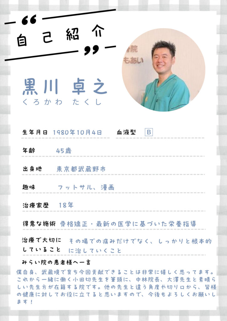 新しく院長に赴任することになるのは、現在小金井本院の院長である黒川先生になります。